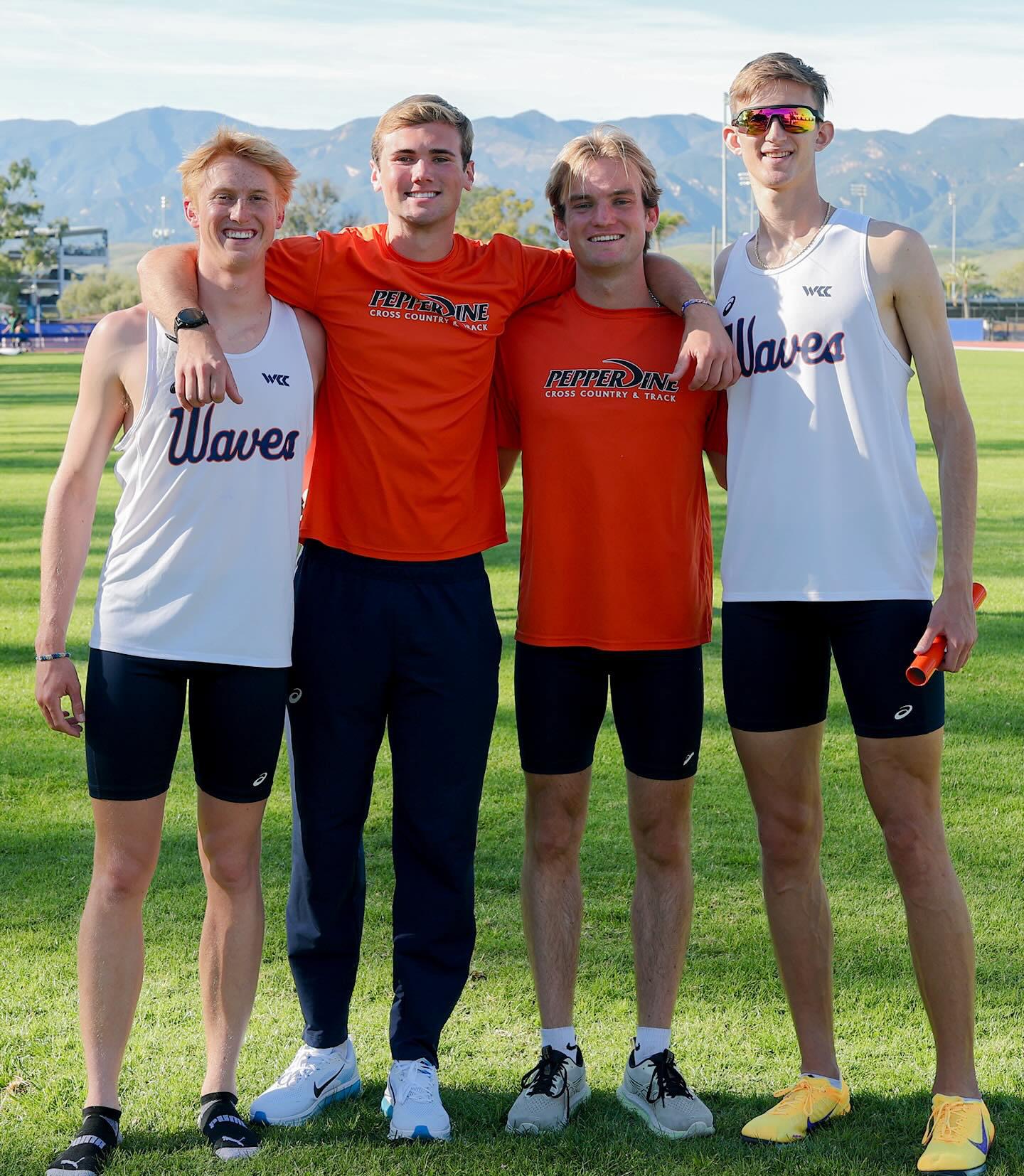 The Pepperdine track and field team’s 4x800 relay team (from left) Beckett Sullivan, Alex Nield, Ryan Fabian, and Parker Buchheit set a school record in winning their event at the March 7 meet in Santa Barbara. Photo courtesy of Pepperdine Athletics