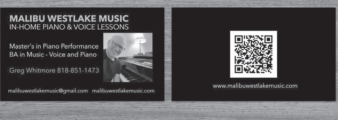 In-Home Piano and Voice LessonsMaster’s in Piano Performance. BA in Music - Voice and Piano. 20+ years experience. Contact Greg at 818-8511473. malibuwestlakemusic@gmail. com. www.malibuwestlakemusic. com