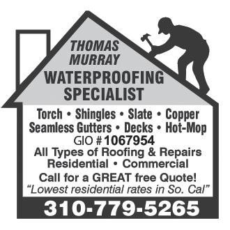 Roofing THOMAS MURRAY, WATERPROOFING SPECIALIST Seamless gutters, slate, decks, shingles, copper, hot-mop, torch. All types of Roofing and Repairs. Residential* Commercial* Industrial. Call for a GREAT free quote 310-779-5265. #726424. Bonded/Insured.
