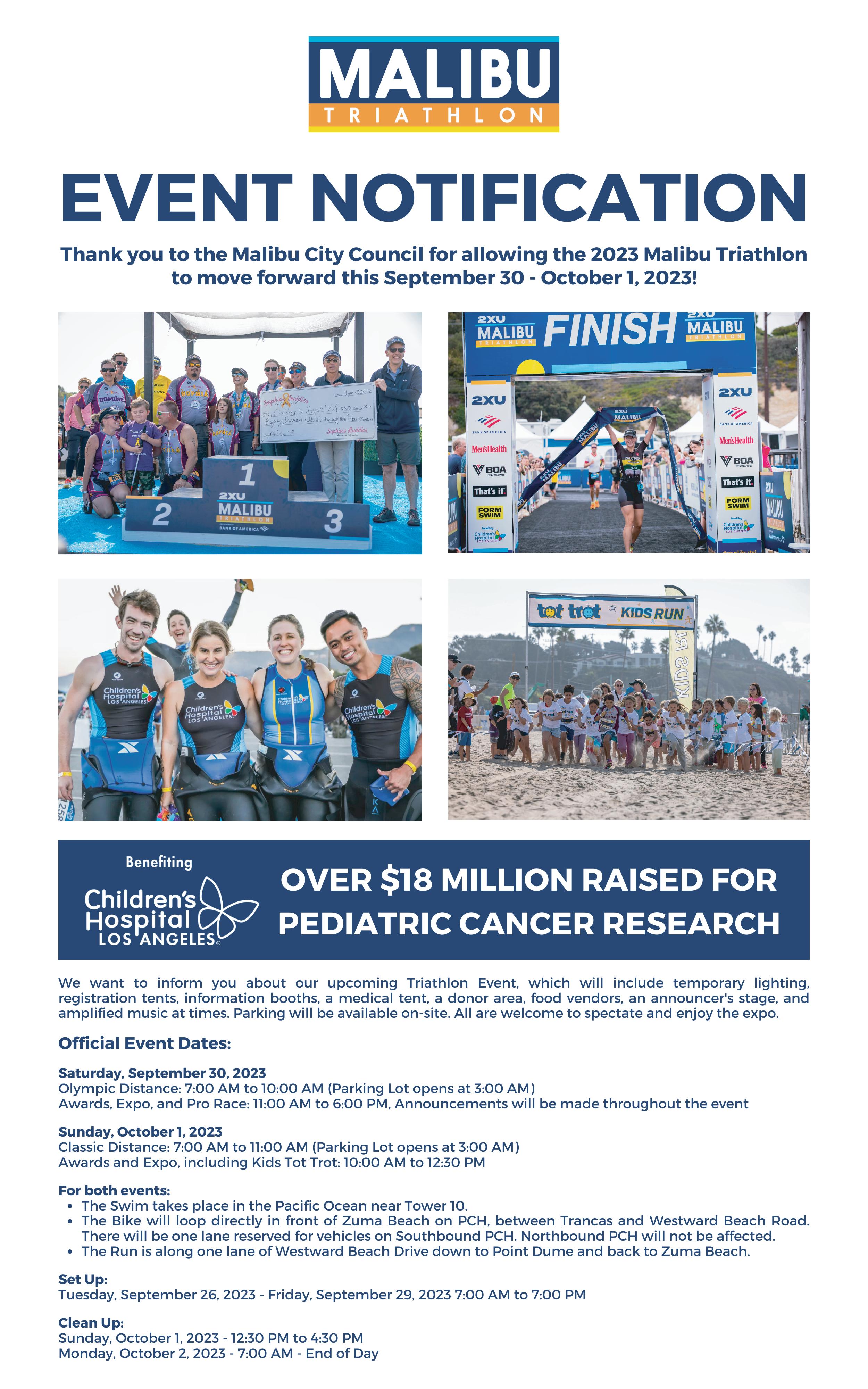 The Triathlon will be held as scheduled on Sept. 30 and Oct. 1 at Zuma Beach, using a city-approved modified bicycle path because of the Zuma underpass closure. Approximately 3,700 participants will swim, run, and bicycle.