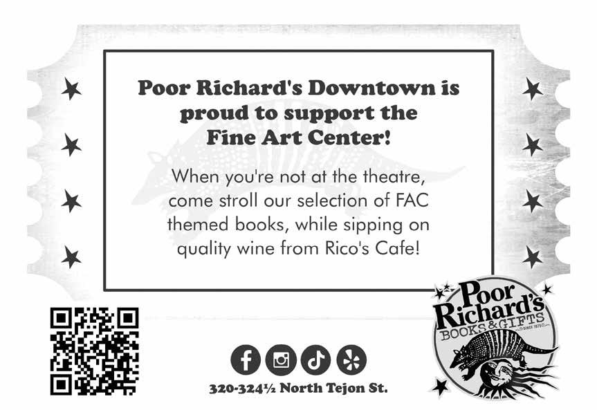 Gleason Bauer (Director) began as a student artist with the Bemis School’s Young Actors Theatre Company. Now, several decades later, they are returning to the Fine Arts Center to complete a remarkable full circle. Serving as an Artistic Associate, Gleason is working alongside Producing Artistic Director Chris Sheley to envision next season’s programming. This leadership role builds on Gleason’s recent multifaceted contributions, including directing The Roommate and designing sets and costumes for Naked Mole Rat Gets Dressed. Between then and now, Gleason has served as the Associate Artistic Director of Boulder’s Square Product Theatre, where they won the True West Award for their direction and design of the ensembledevised piece Slab, as well as a Colorado Theatre Guild nomination for Best New Play. As co-founder and Artistic Director of Los Angeles’s Zoo District, they also helped build an internationally recognized ensemble that earned 44 nominations and 26 Ovation, Garland, and LA Weekly Awards. Gleason brings this award-winning artistry into the classroom, having taught at Colorado College, Pomona, Marlborough, and the North Carolina Governor’s School, among others. They currently teach at Naropa University’s School of the Arts, where they earned their MFA in Contemporary Performance. www.gleasonbauer.com