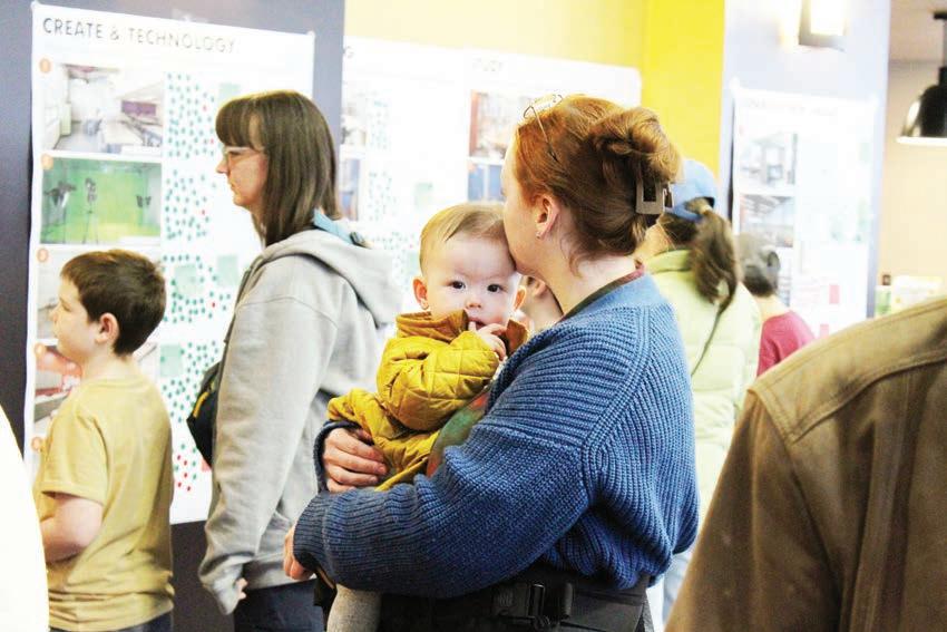 South Je co resident Morgan Vincent and her 1-year-old Orion review public feedback posters during a Feb. 22 open house at the future South County Library building. The library asked the 270 attendees for ideas on how they would like the existing commercial building and surrounding outdoor space to be renovated as a future Je co Public Library branch.