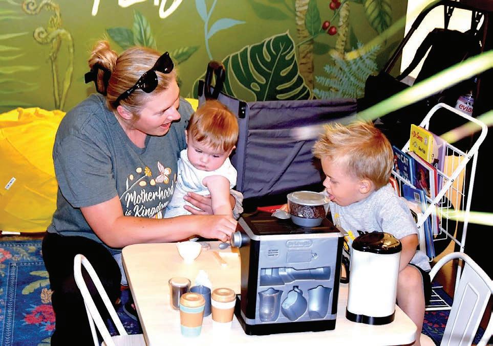 Brook Trotter and her sons, Odin and Austin, play with toys in the kids’ area, which features a miniature co ee maker.