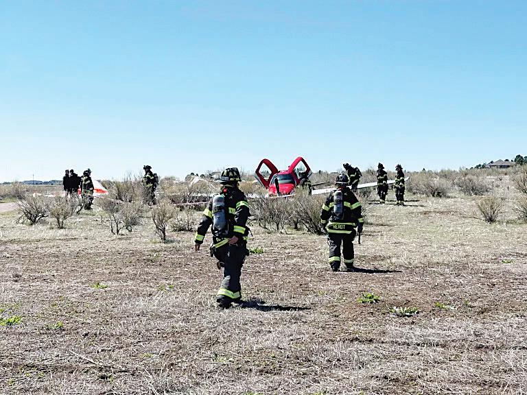 Firefighters inspect the crash site of a Cirrus SR-22, which collided with another aircraft as both prepared to land at Centennial Airport on May 12. COURTESY OF SOUTH METRO FIRE RESCUE