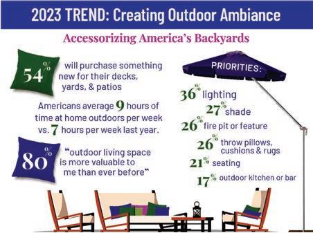 Above right is a graphic from a 2023 article by the International Casual Furnishings Association which carried the following headline: “In 2023, Americans Will Spend Their Money on Lighting, Rugs, Umbrellas and Other Accessories to Spruce Up Their Backyards, Decks and Patios.”