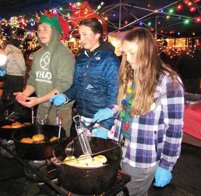 Members of Scout Troop 888, from left, Mitchel Major, Vivi Leswing and Leah Hartman fry doughnuts to sell at the troop’s booth at the Holiday Walk.
