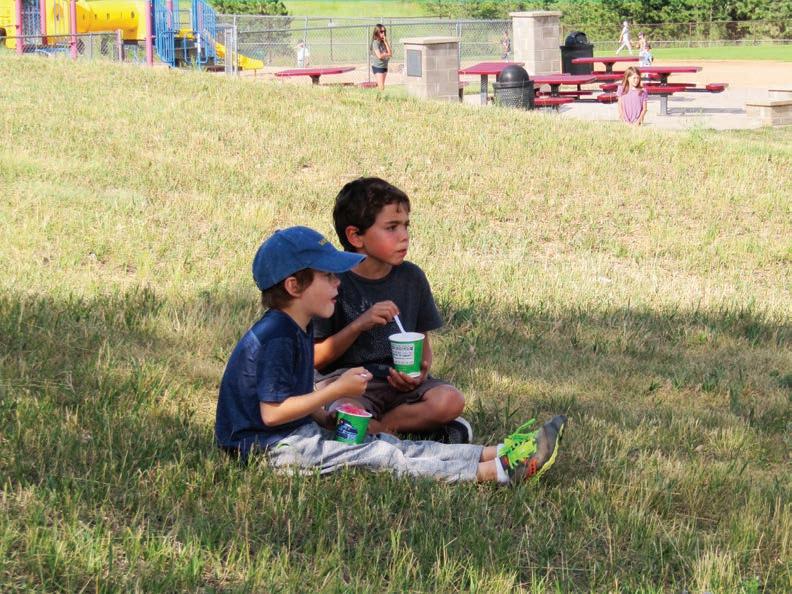 Best friends and first graders Weston Deen and Matthew Colosimo sit under a tree to eat their snowcones at the Bergen Meadow Elementary School back-to-school gathering on Aug. 14.