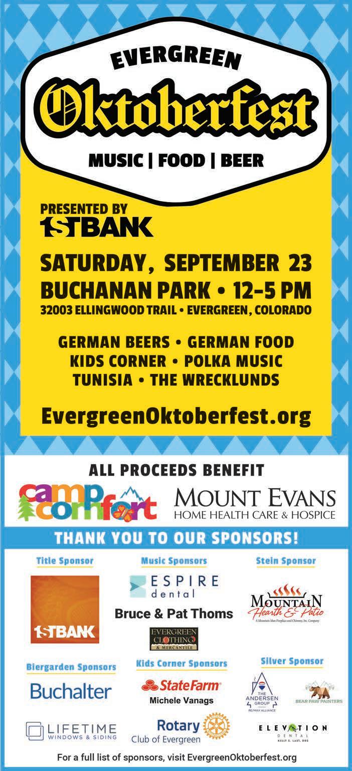 Oktoberfest to bene t Mount Evans Home Health Care & Hospice’s Camp Comfort will be from noon5 p.m. Sept. 23 at Buchanan Park. Enjoy German beers and food, polka music and the bands Tunisia and e Wrecklunds. For more information and tickets, visit EvergreenOktoberfest.org.