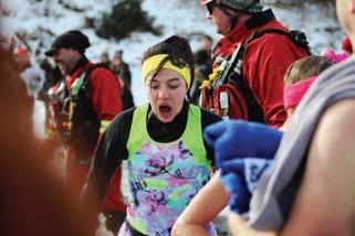 Evelyn Bowen, a student at Evergreen Country Day School, reacts to the cold after doing the Jan. 1 Evergreen Lake Plunge. Evelyn and her classmates dressed as 1980s dancers