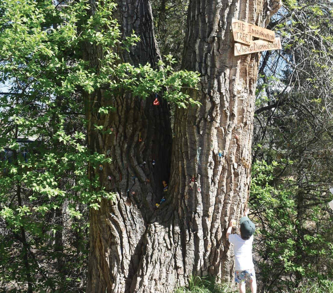 Higher above the crevice, adorned with painted rocks, rubber duckies and baubles that were added over the years, carved wooden planks read, “Imagination Tree,” a place “Where Dreams Begin.” e sign is just past the bark-embedded horse and swaying cowbell.