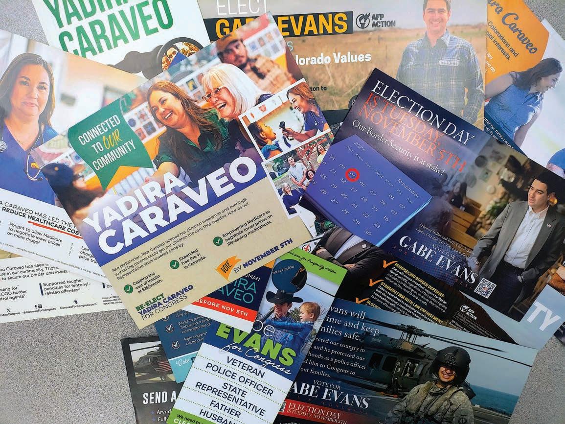 A sampling of political mailers sent to residents in Colorado’s 8th Congressional District from the Evans and Caraveo campaigns. CCM STAFF