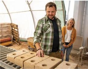 Here is a picture of homeowners Matteo Rebeschini and Melanie Glover at the factory where the Ecoblox for their home were being manufactured. Ecoblox also have a smaller carbon footprint than traditional bricks, because they are not fired, but merely compressed.