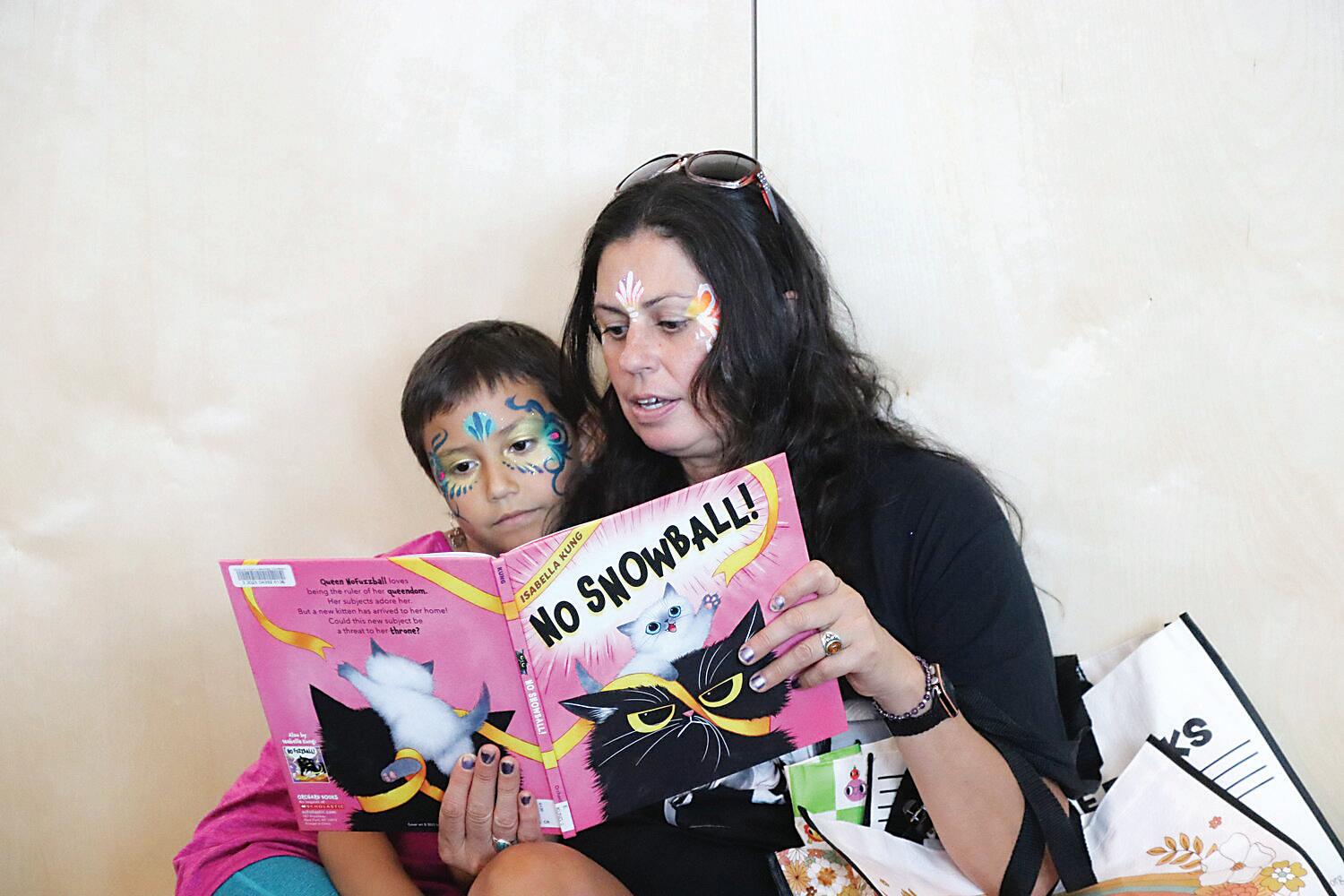and enjoying story time. Amid the crowd, Sadie Madrid and her daughter Indigo, 9, took advantage of an empty bench to read “No Snowball!” together.