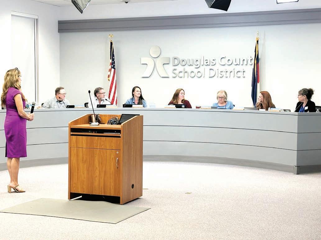 Douglas County School District Superintendent Erin Kane speaks to the school board about sta ’s recommendation to put a $490 million bond on the November ballot to pay for new schools and building maintenance. The $490 million bond would not raise taxes.