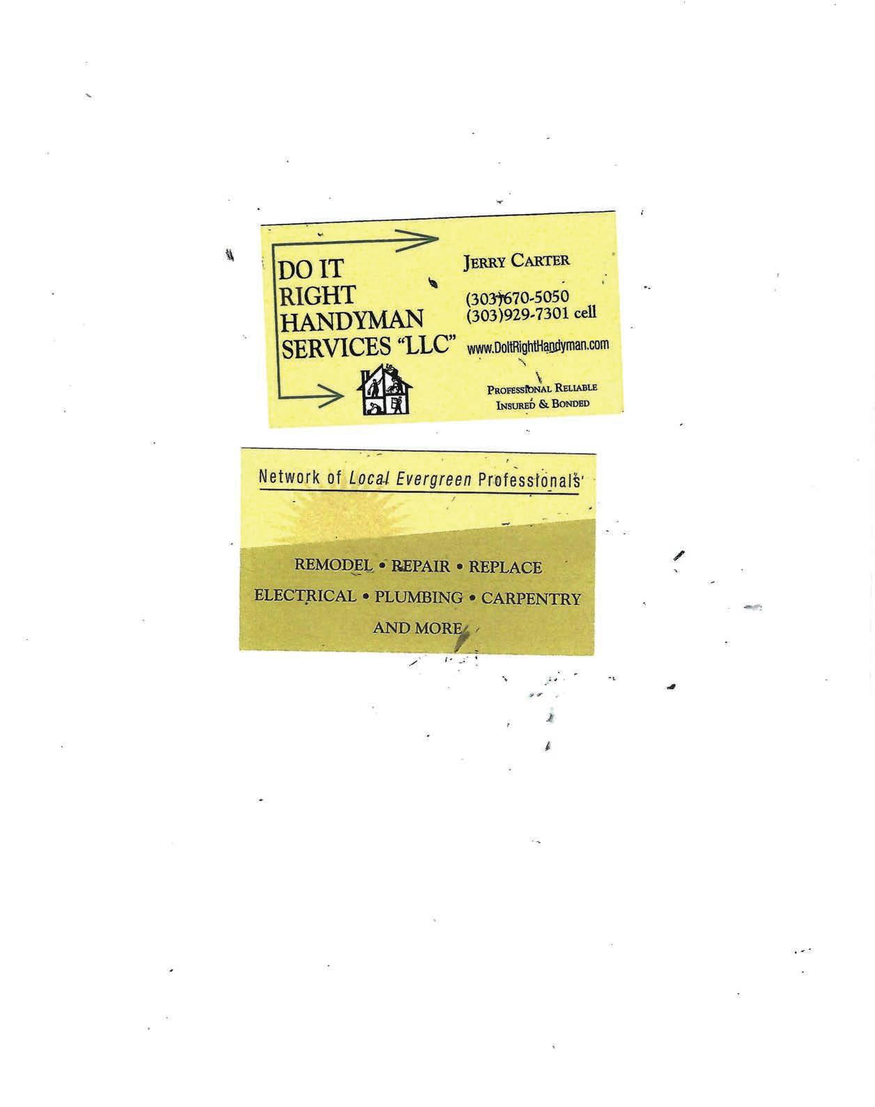 Hello Evergreen, Conifer, Pine, Idaho Springs, Georgetown, and my Friends, This is Jerry Carter with Do It Right Handyman Services LLC. I want to take this time to inform you that I will be moving away from Evergreen by the end of the year. I have tried to stay in Evergreen to continue running my business, but reasons out of my control, it is time to move on. I have truly enjoyed living here in Evergreen since 2001, meeting every one of you, you are like family to me. I will miss you all, and will keep all the memories close to my heart. My Cell phone will still be the same 303-929-7301 if either of you feel the need to call. I would love to hear from you. The closing on our home will be December 30, 2022, after that I will be moving to the western slope of Colorado.
