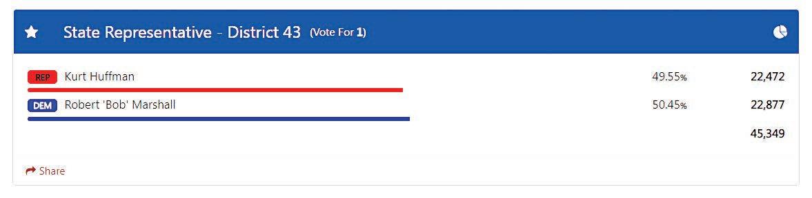 Voters in House District 43, which covers the Highlands Ranch area, elected Democratic candidate Robert Marshall over the incumbent Republican Rep. Kurt Huffman in a race decided by less than one percentage point.
