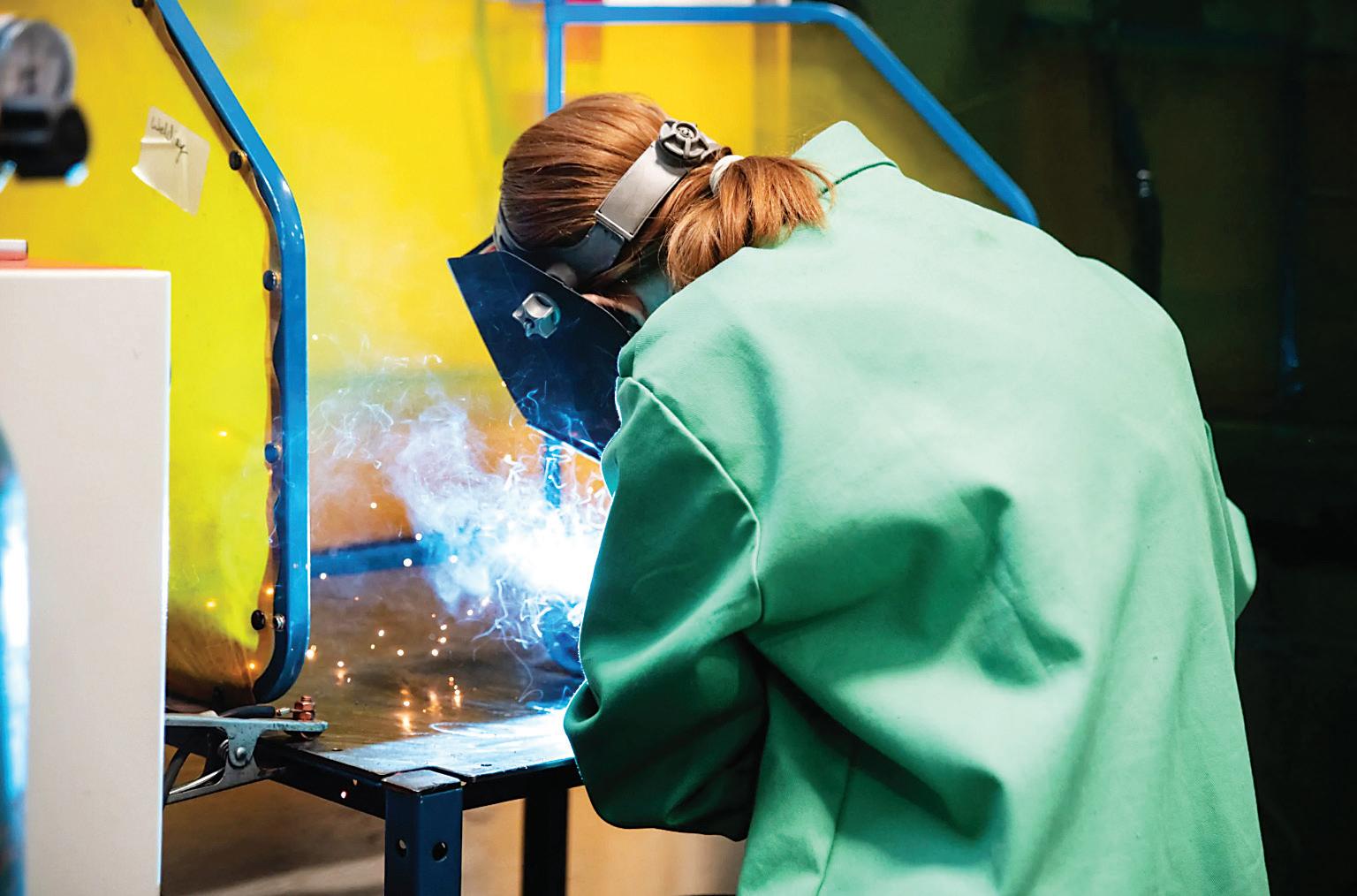 In another room, sparks are ying as Kate Sneddon, 20, uses a welding machine to smooth out a piece