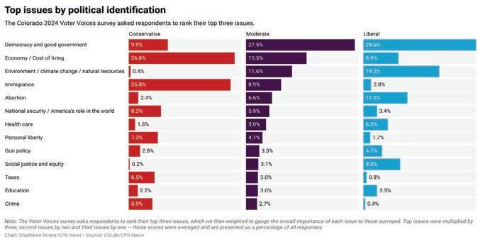 ousands of Coloradans responding to a survey by their local newsrooms say candidates competing for their votes this year need to be focused primarily on several broad issues: democracy and good government, the economy and cost of living, the environment, climate and natural resources, immigration and abortion.
