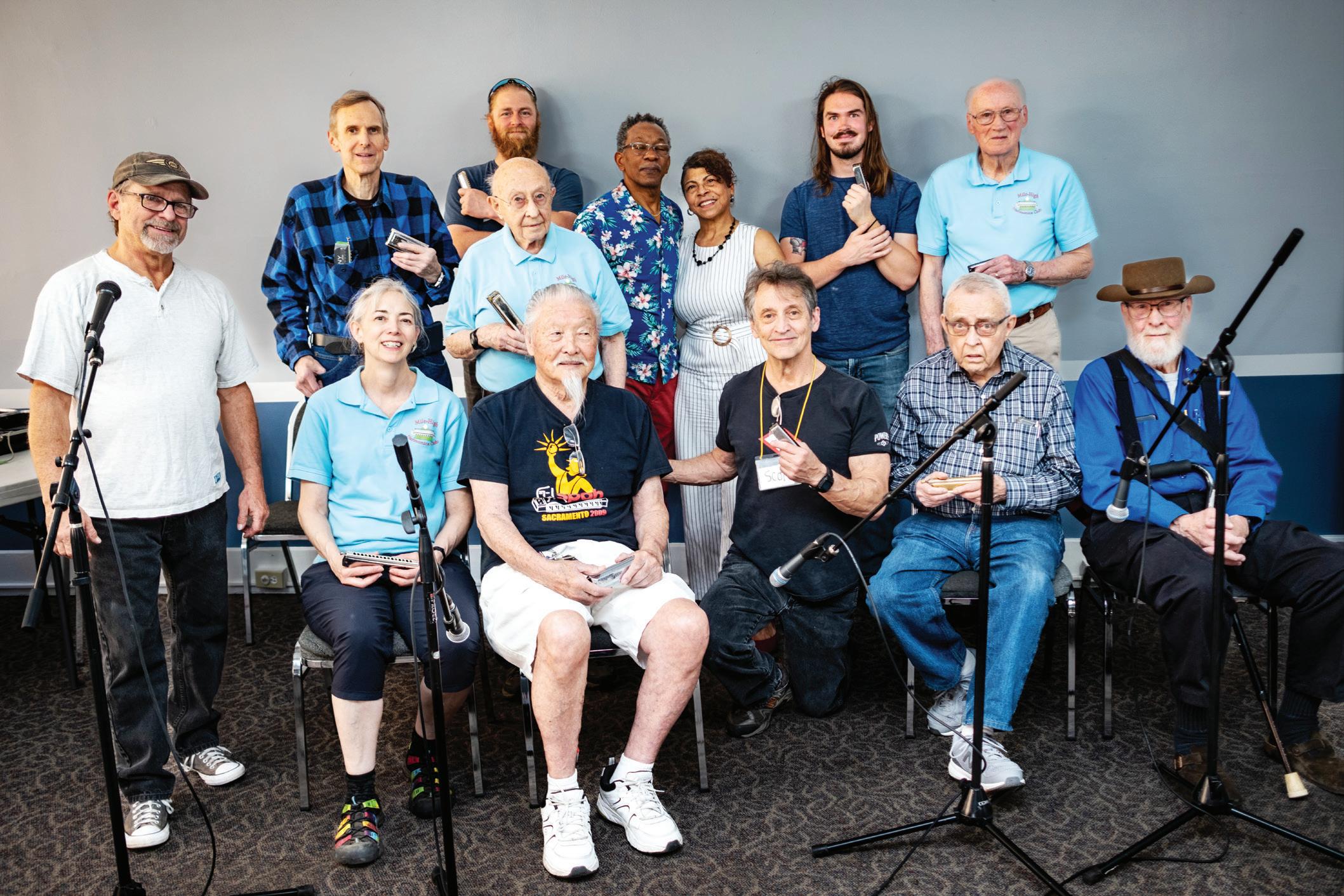 Thirteen of the 65 harmonicists with the Mile High Harmonica Club posed for a portrait at a recent meeting. The club meets twice a month and welcomes new members, from beginners to experts.