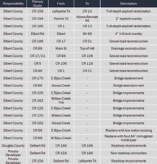Based on these categories and the county’s scoring schematic, projects addressing future anticipated congestion issues, particularly in the northwestern area of Elbert County, scored better than elsewhere in the county. Additionally, projects addressing de ciencies, such as ongoing maintenance issues, poor pavement or bridge conditions, or ooding issues score better than others. From their study, a total of