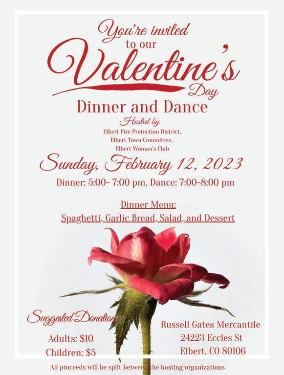 e event will take place at the Russell Gates Mercantile Co. building, the informal community center for the Town of Elbert. e Valentine’s Day Dinner & Dance will be hosted by three organizations crucial to the functionality of the Town of Elbert: e Elbert Fire Protection District, e Elbert Town Committee, and the Elbert Woman’s Club.