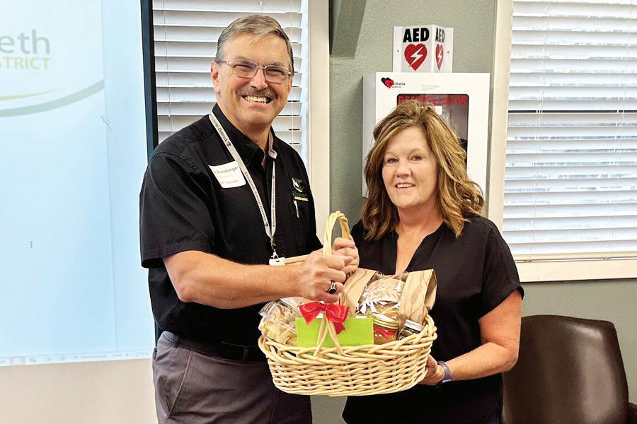 Elizabeth School District Superintendent Dan Snowberger, left, honors Food Services Director Teri Maher for her 20 years with the district.