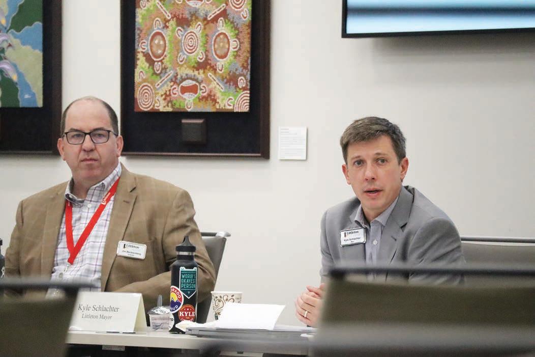 Littleton City Manager Jim Becklenberg, left, and Mayor Kyle Schlachter discuss policies aimed at curbing homelessness with other south metro city leaders.