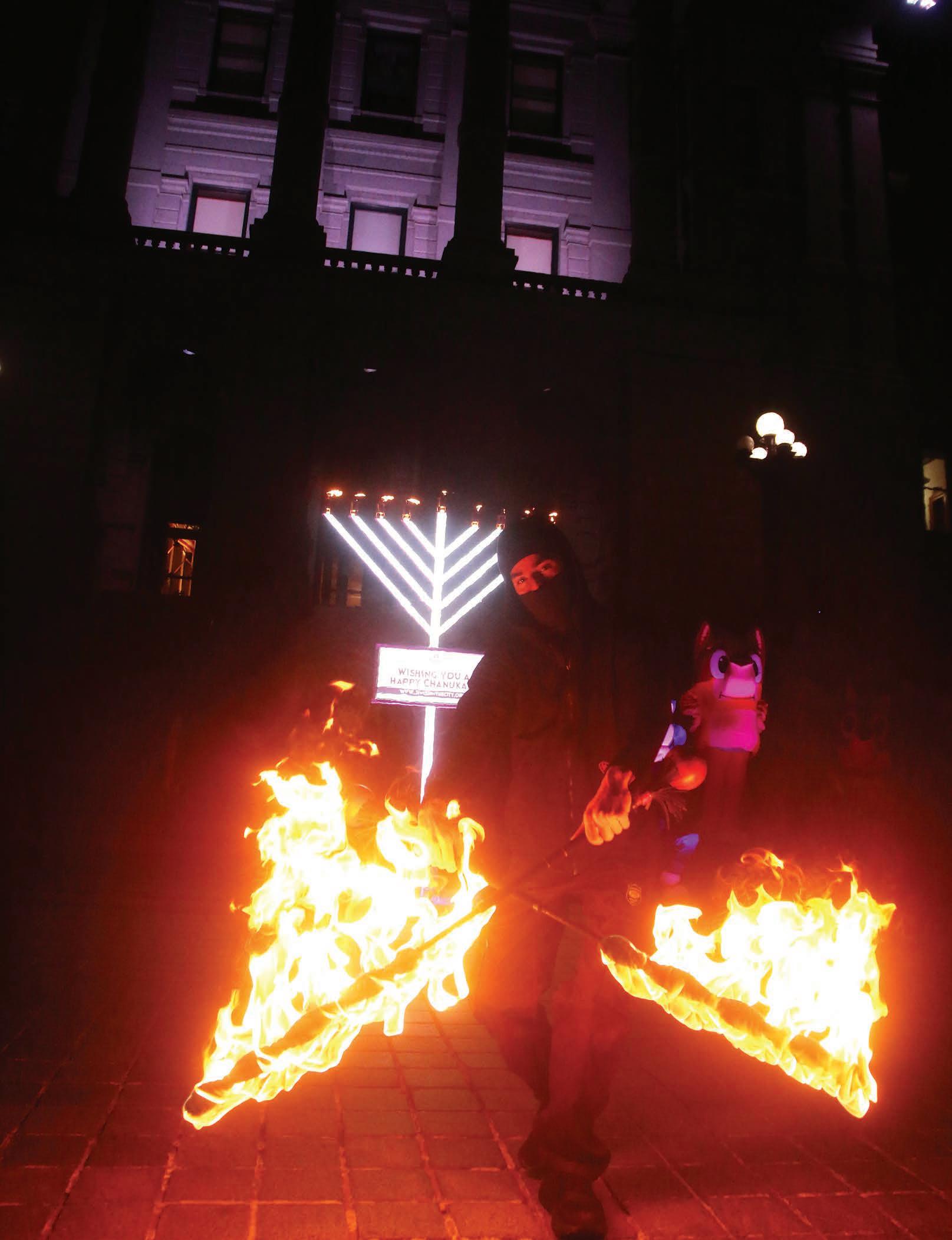Zach Zevallos, a fire dancer, performs Jan. 1 for the Chanukah at the Capitol event, hosted by Jewish in the City, where hundreds of people attended. PHOTO BY ERIC HEINZ Story on Page 8.