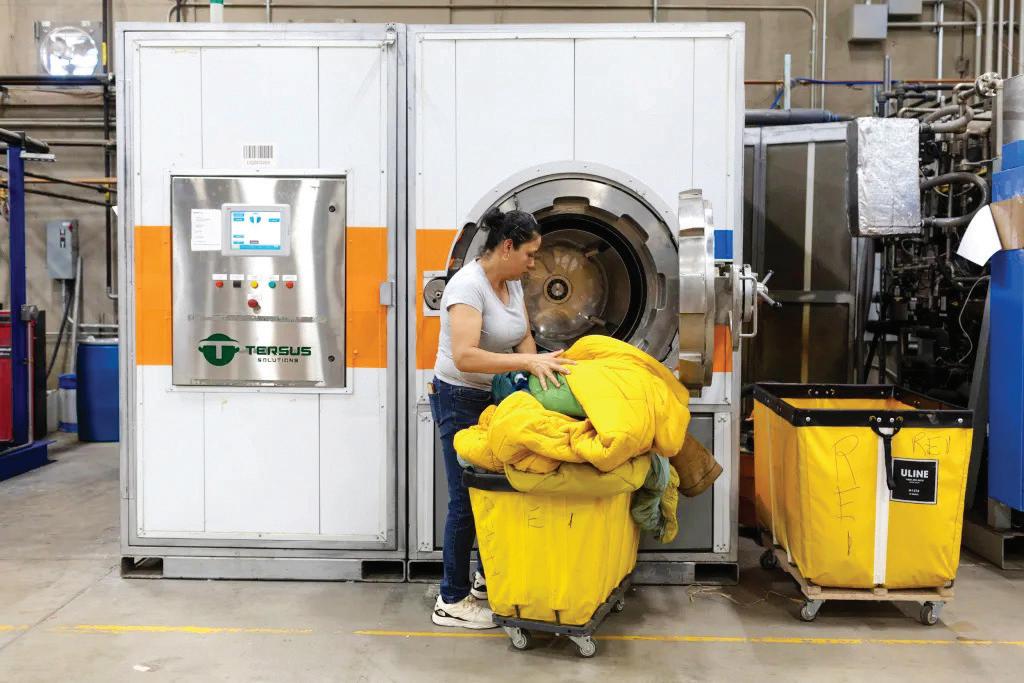 Tersus Solutions employee Maria Mara unloads recycled sleeping bags from the liquid CO2 cleaning systems on the warehouse floor on June 12 in Englewood.