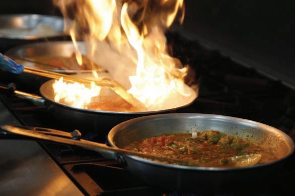 Budhathoki stirs a flaming skillet of aaloo gobi, or potatoes and cauliflower, during the