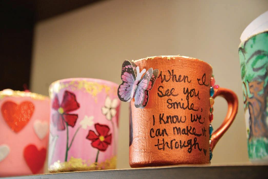When patients complete the 30 day program, they decorate a co ee mug that often includes the date of their sobriety. e mugs are then hung on a mantel. After one year of sobriety, the person can come back and pick up their mug.