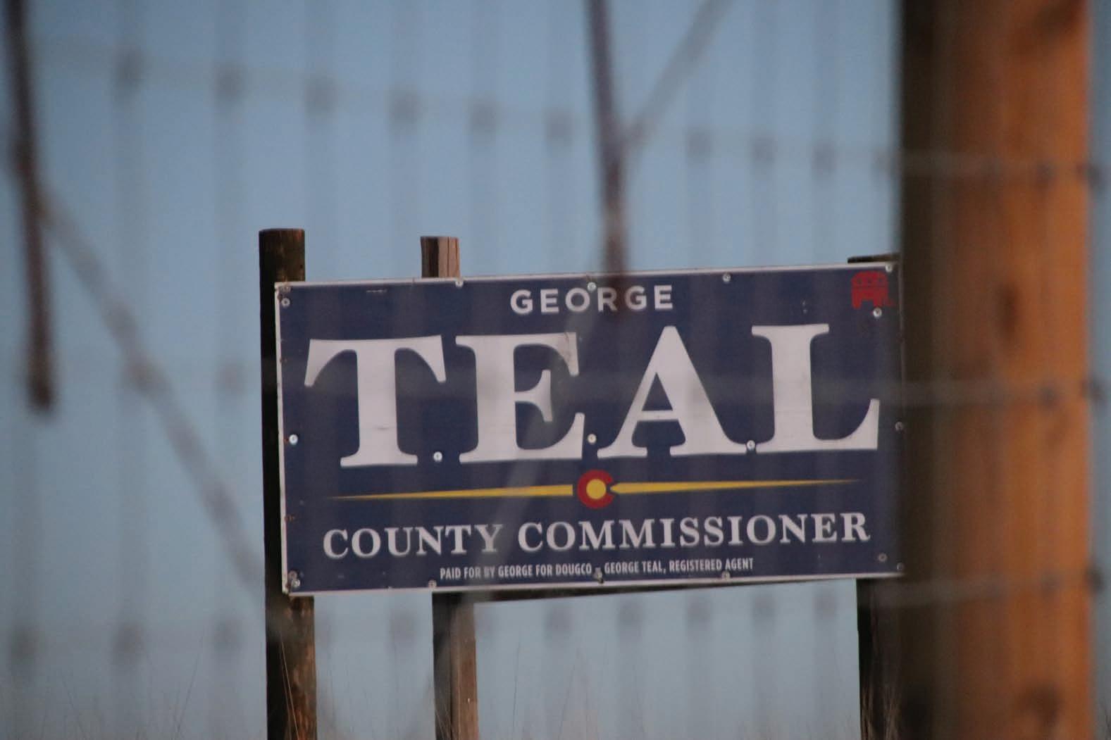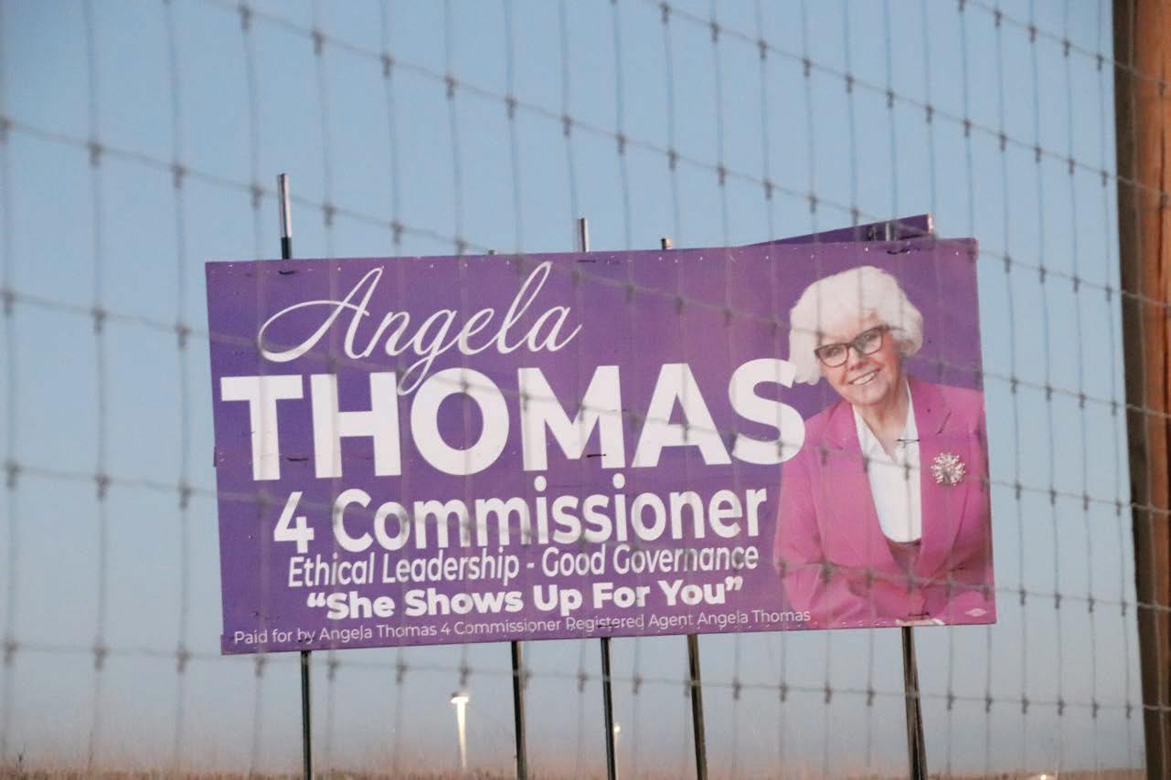 A large campaign sign for Democrat Angela Thomas, running for Douglas County commissioner, stands on Sept. 20 along Interstate 25 in the Castle Pines area.