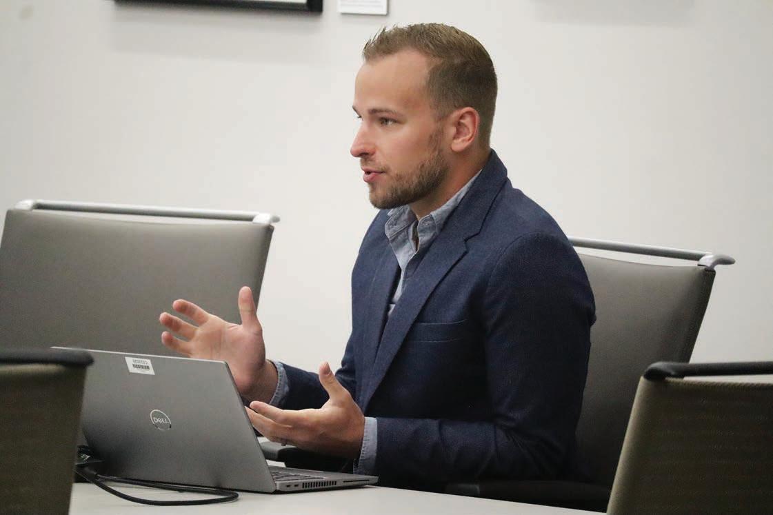 Littleton City Manager Jim Becklenberg, left, and Mayor Kyle Schlachter discuss policies aimed at curbing homelessness with other south metro city leaders.