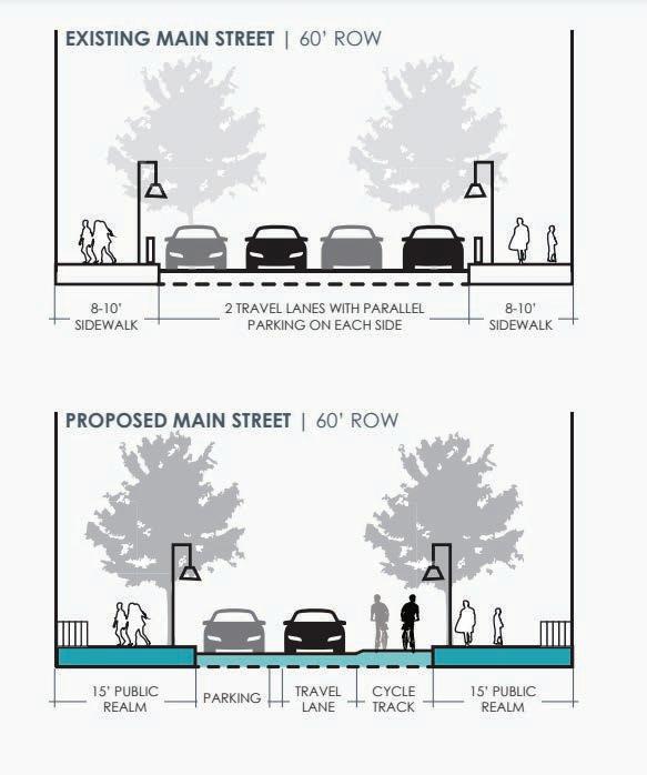 the Bridge Street intersection. e second would convert Main Street to one-way tra c headed towards Bridge Street from the north and the south — northbound between Bush and Bridge and southbound from N. Cabbage to Bridge. at plan would preserve one side of on-street parking in line with the ow of tra c and widen sidewalks slightly. e third option would make Main Street a southbound one-way for its entire path through the downtown, with on-street parking on the west side of the street and slightly wider sidewalks. N. Cabbage Street would become a dedicated one-way road between Egbert and its intersection with Main Street. and would get a new tra c signal.
