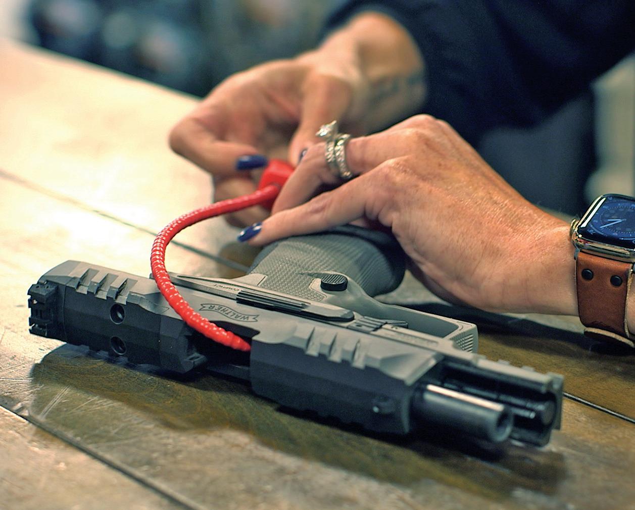 Demonstrating the use of a cable lock on a handgun.