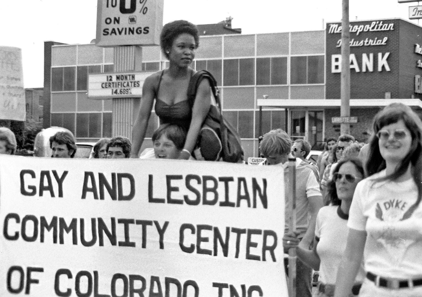 The 1981 Pride Parade passes the corner of East Colfax and Lafayette. Three decades later, the vacant Metropolitan Industrial Bank would be purchased, renovated and transformed into The Center on Colfax, the first building to be owned by the LGBTQ+ organization.