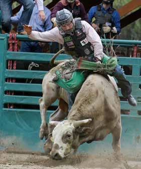 sTeer wresTling deMands coordination between two mounted cowboys – the contestant and a hazer who controls the steer’s direction – and their horses. The cowboys back their horses into the box on each side of the steer. When the contestant nods, the chute gate opens and the steer gets a head start before the cowboys start to chase him. As the steer wrestler draws even, he dismounts from his horse, which is moving at perhaps 30 miles an hour. He grasps the steer’s horns and digs his boot heels into the dirt to slow down the 500- to 600-pound steer. Then he wrestles the steer onto its side; when all four legs point in the same direction, the clock stops. Times vary widely depending on the size of the arena.