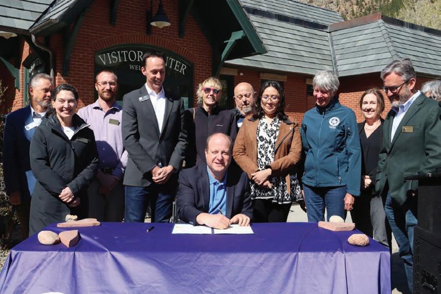 Colorado Gov. Jared Polis, seated, signs a bill into law on May 15 that will help enforce a mu er requirement on all commercial vehicles. The bill was sponsored by legislators representing Je erson and Clear Creek counties, among others.
