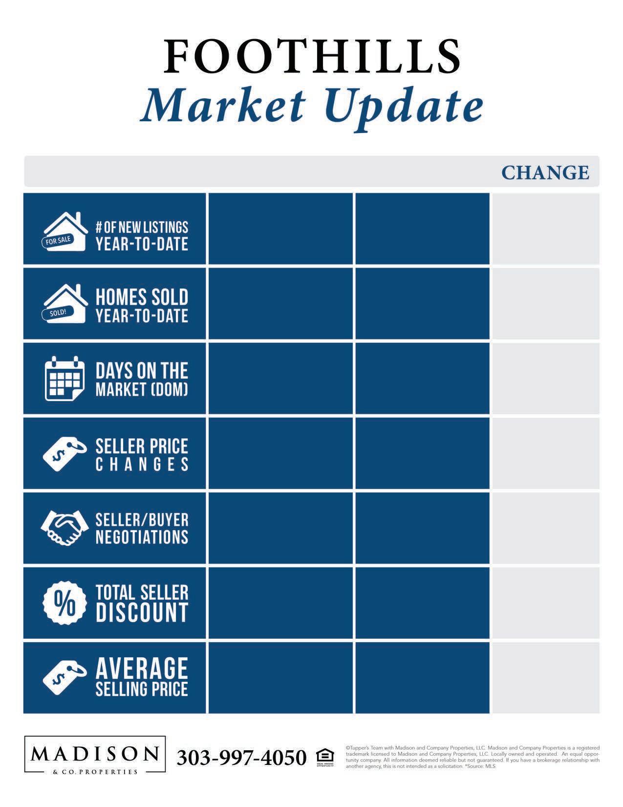 This data covers the entire foothills area, from I-70 on the north to Bailey on Hwy 285 on the south. What’s happening in your particular neighborhood and price point will vary from these overall figures, which is why it is important to contact your Madison broker for specific information.