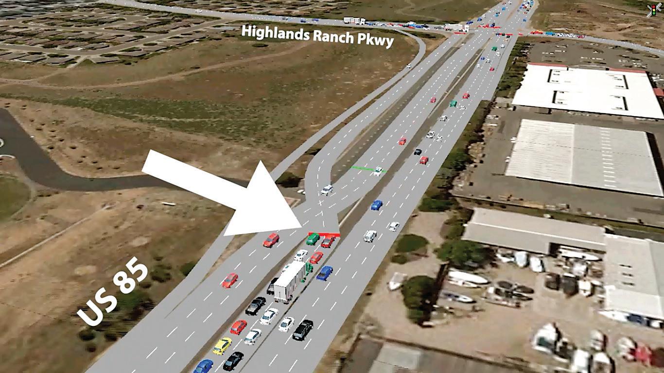 An animated video shows vehicles going southbound on U.S. Highway 85 planning to turn left onto eastbound Highlands Ranch Parkway shifting into the turn lanes before the intersection.