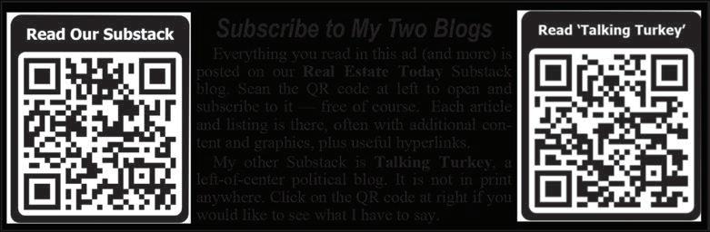 posted on our Real Estate Today Substack blog. Scan the QR code at left to open and subscribe to it — free of course. Each article and listing is there, often with additional content and graphics, plus useful hyperlinks.