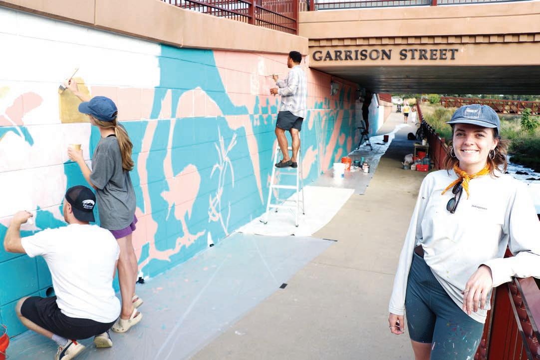 Denver-based muralist Catie Michel stands beside the mural she designed for the Garrison Street overpass.
