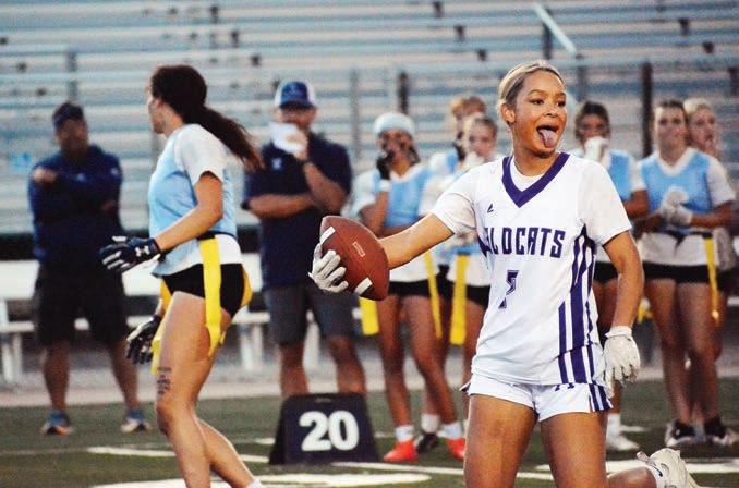 “I have all the same girls I had last year,” Swanson said of the A-West team that won the state title in 2023 in the second year of the pilot program before girls ag football got o cially sanctioned by CHSAA for the Fall 2024 season. “I have great playmakers and my blockers are great. ey give me time. We have so many threats on offense.”