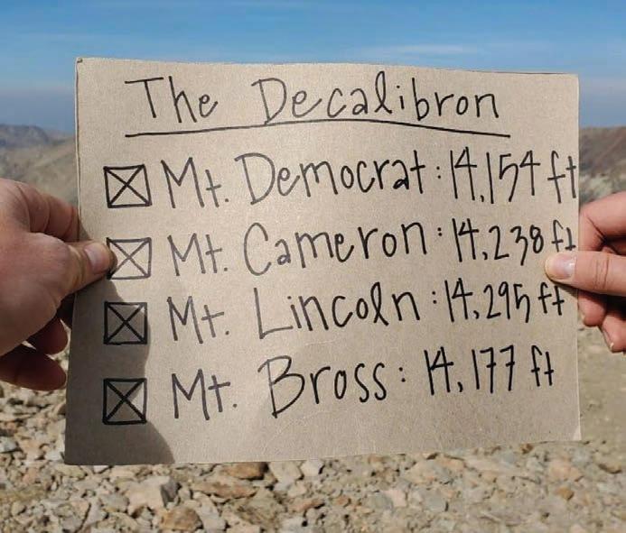 “Short on time but looking to bag a few peaks? en you need to check out the vaunted DeCaLiBron. is funny name represents a unique route where you can bag four (or three, there’s still some debate) 14ers in one go,” Lundgren said. “Hike Mount Democrat, Cameron, Lincoln, and Bross on a seven-mile trail north of Fairplay that ascends just over 3,000 feet in elevation. Some claim that Mount Cameron is not o cially a 14er as it has only 118 feet of prominence from its parent peak, technically classifying it as a sub-peak. However, technicalities aside, I still tell my friends I bagged four 14ers in a day. You should, too.”