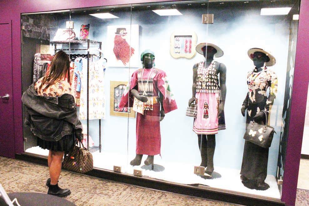 Along with the fashion pieces, Maldonado Bad Hand described the photo collage in the center of the exhibit, above the doorway to the museum’s large meeting room. e photos include many of the co-curators’ family members and friends, as all the photos were donated by Native American community members.