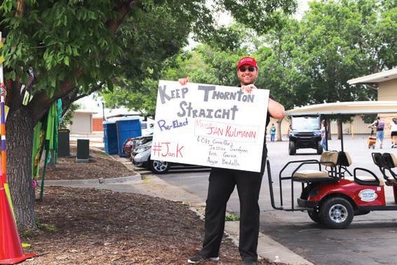 Dariush Namazi in character as Danny Kulmann holding a “Keep Thornton Straight” sign at Adams County Pride on June 10 at Riverdale Regional Park.