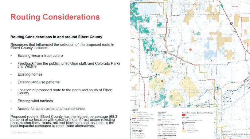 Some attendees are already engaged in condemnation proceedings with Xcel and couldn’t speak freely on the topic. Fortyeight Elbert County landowners will have the transmission line going through their property; 13 of those are currently in condemnation proceedings; and 27 have already reached an agreement with Xcel to acquire an easement.
