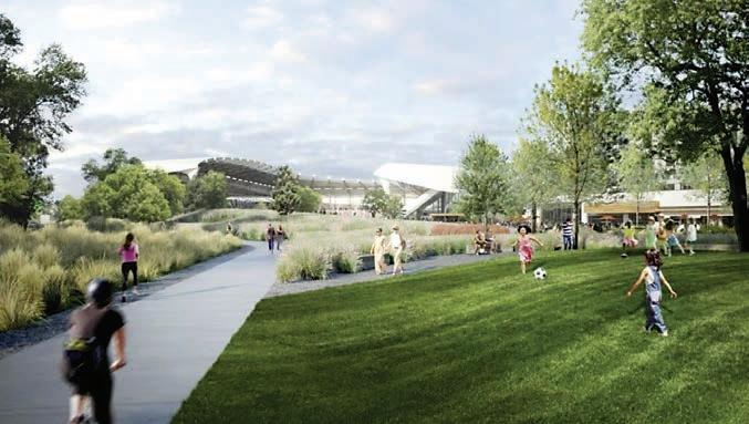 A rendering of the paths and parks surrounding the planned National Women’s Soccer League Stadium in Denver.