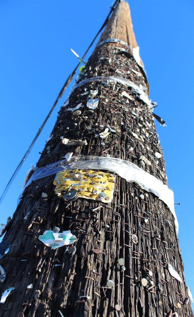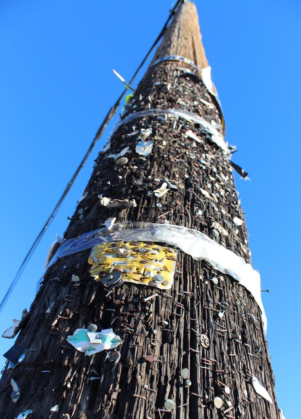 An example of an EEA pole with foreign object damage. Note the difference in pole condition where the staples, nails, and screws have been placed versus higher on the pole.