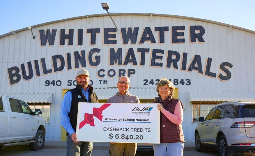The Grand Valley Power Board of Directors approved in November the retirement of more than $1 million in CashBack Credits to members. Directors recently presented CashBack Credit Checks to members Whitewater Building Materials and Mesa County Valley School District 51. When you signed up for electric service with Grand Valley Power, you became more than just a customer—you became a member-owner of our electric cooperative. Because we operate at cost, any excess revenue, known as margins, stays right here in our community. Rather than paying outside investors, our Board of Directors allocates these funds as capital credits and periodically returns them to members based on how much electricity they used during the year. If you have questions about CashBack Credit checks, please visit gvp.org/ cashbackcredits